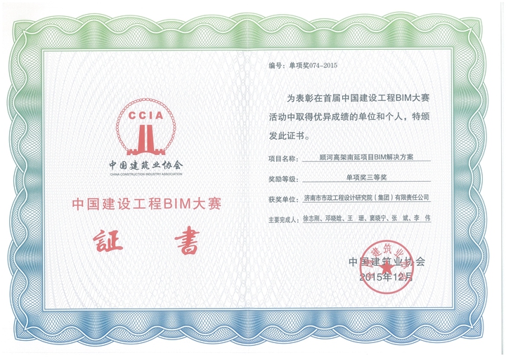 12月29日,首屆中國建設(shè)工程BIM大賽頒獎暨表彰大會在??谂e行,集團(tuán)兩項(xiàng)成果獲獎,其中“BIM技術(shù)在濟(jì)南市唐冶新區(qū)市政工程中的應(yīng)用”獲得二等獎,“順河高架南延項(xiàng)目BIM解決方案”獲得三等獎;另外,“BIM技術(shù)在分離式立交工程中的應(yīng)用——青島長江路與昆侖山路立交”得到書面表彰。